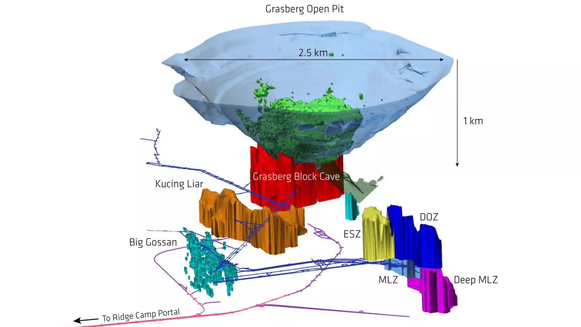 Подземную добычу меди применяют, когда рудное тело залегает на глубине сотен метров и более, где открытая разработка становится экономически или технически невозможной. В этом случае создают шахты и систему тоннелей: руду бурят, взрывают и извлекают на поверхность с помощью подъёмников или конвейеров. Современные рудники могут уходить на 1–1,5 км под землю. Например, на месторождении Грасберг (Индонезия) добыча ведётся на глубине свыше 1 км.