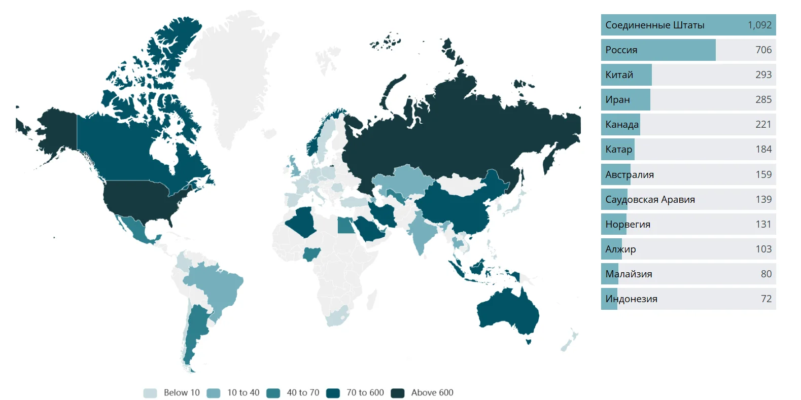 Хотя мировой объём добычи обновил рекорд (+1,2% в году), основу предложения формируют несколько крупных регионов: Северная Америка, Ближний Восток и Евразия. Страны-лидеры по добыче газа используют разные модели развития: