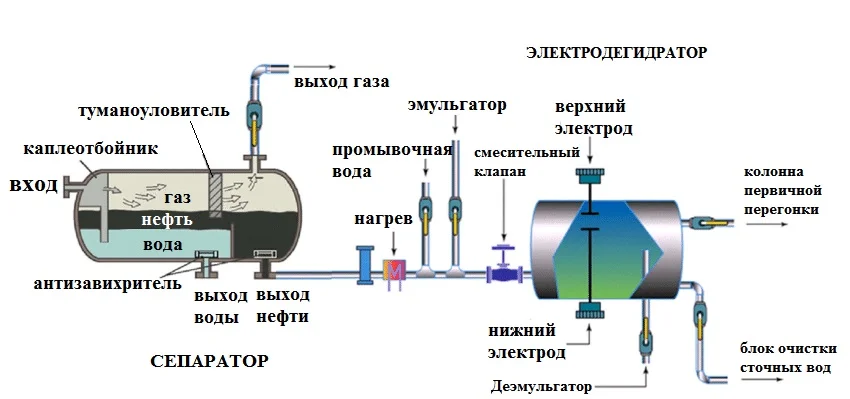 Сырье нагревают, добавляют деэмульгаторы и помещают в электрическое поле. Под его действием микрокапли воды слипаются и оседают — примерно так же, как конденсат образуется на крышке кастрюли. В результате удаляются влага и соли, и нефть становится готовой к перегонке.