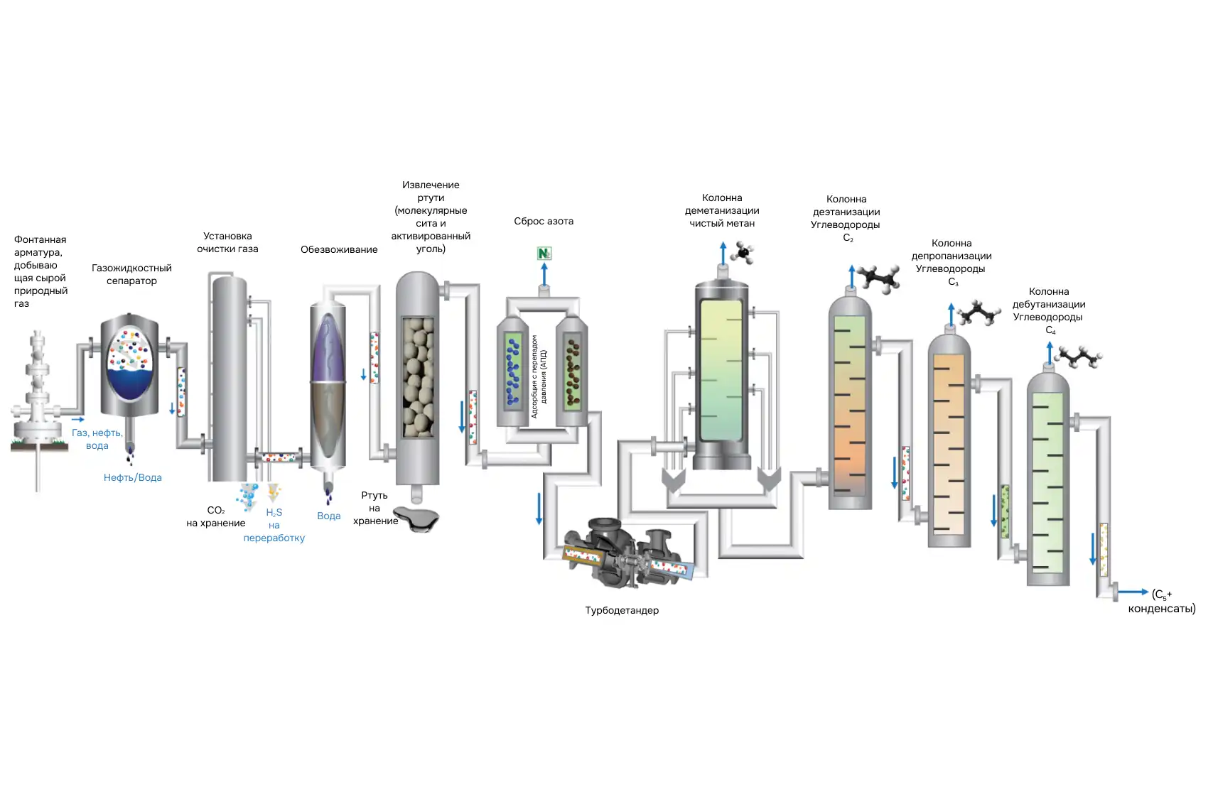 На первом этапе из газа удаляют воду, сероводород, углекислый газ и механические примеси, которые мешают транспортировке и создают ледяные пробки в системах.