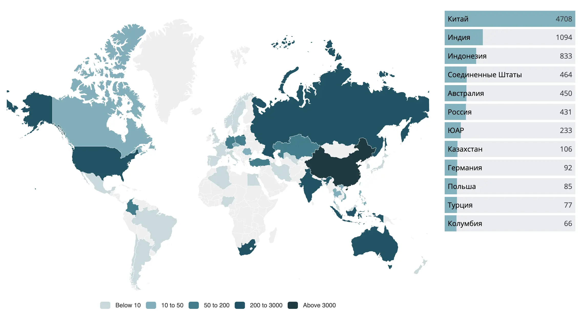 На внешний рынок поступает лишь часть добытого угля — около 18%. Основной объём используется внутри стран, прежде всего в Китае и Индии.